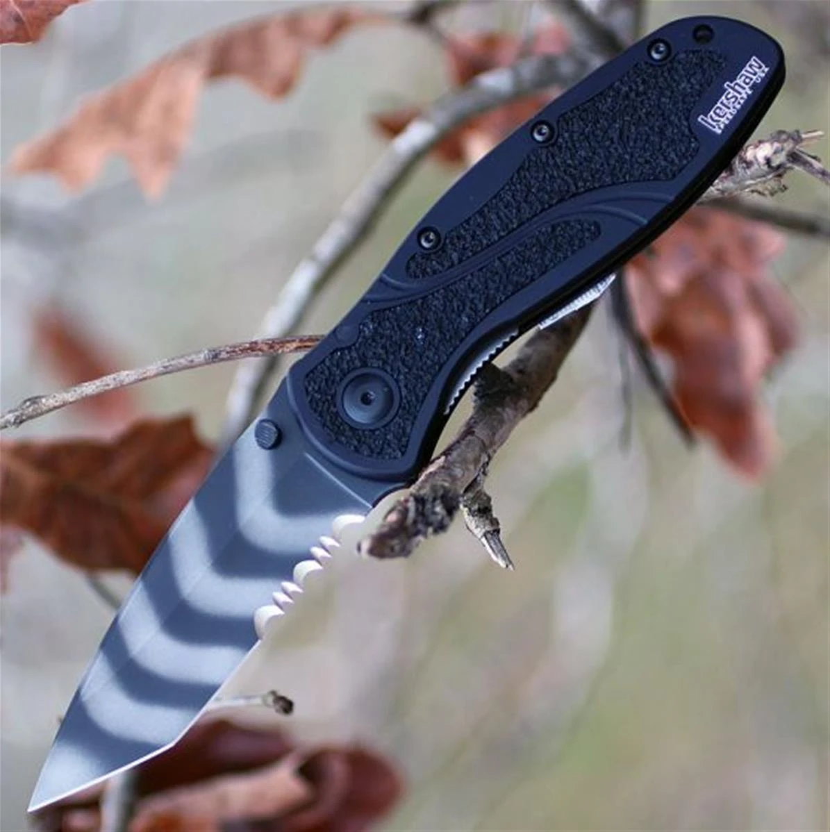 Couteau Kershaw Blur A/O 14C28N Tiger Stripe Tanto pliant – Ouverture assistée de la lame (SpeedSafe assisted opening) – Longueur ouvert 20cm – Longueur fermé 11.43cm – Longueur de lame 8.60cm – Lame tanto serrated en acier Sandvik 14C28N – Dureté 59-62 HRC -Manche en acier & aluminium 6061-T6 – Ouverture de la lame avec le thumb – Sécurité linerlock – Clip de poche – Made In USA