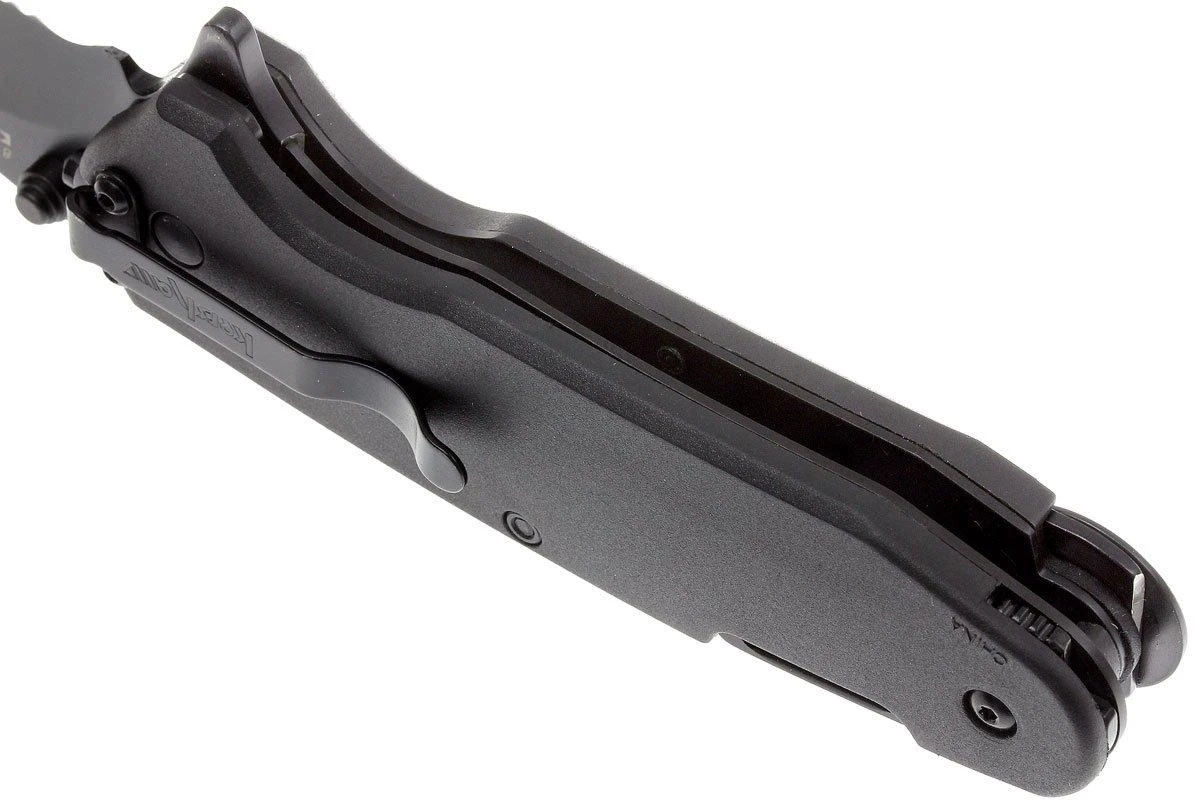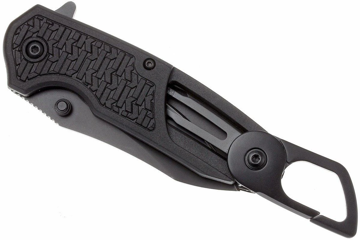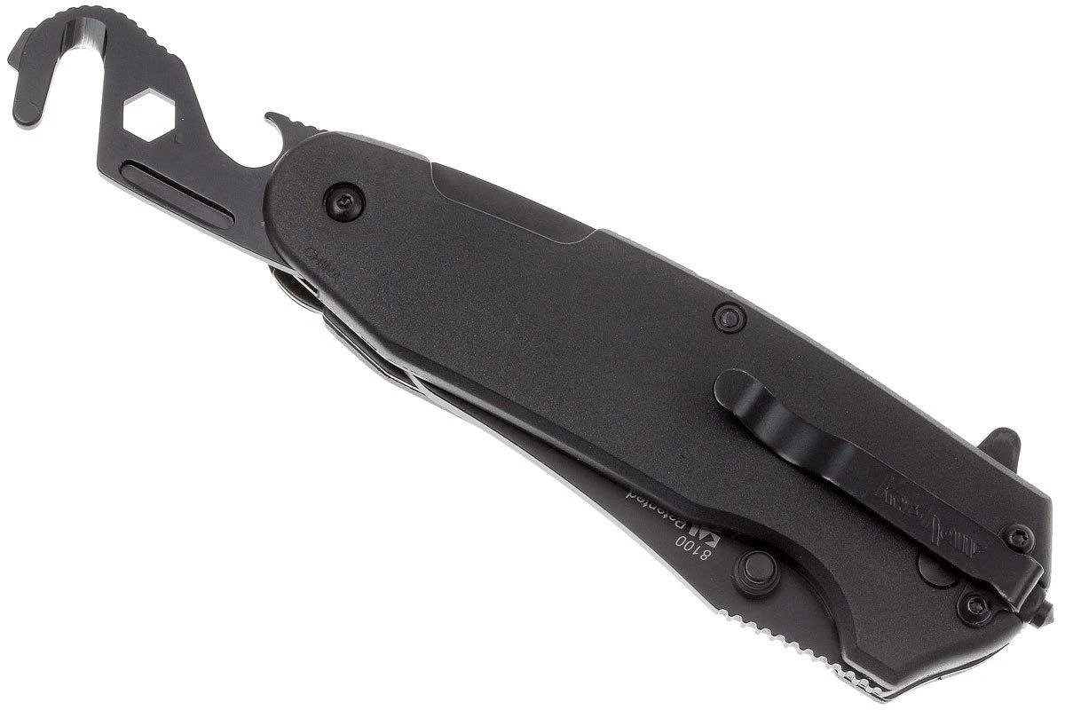 Le Kershaw Funxion EMT est un couteau de poche pratique avec toutes sortes de fonctions utiles qui peuvent bien tomber en cas d’urgence. Outre une lame partiellement dentelée qui peut être ouverte avec un ressort puissant via le flipper, ce couteau dispose également d’un brise-verre. Ainsi, vous pouvez casser une vitre (de voiture) en cas d’urgence. De plus, le manche contient un grand mousqueton pliant, un crochet de coupe, un décapsuleur et une clé polygonale. La lame et toutes les pièces pliantes sont verrouillées en position ouverte avec un linerlock. Afin que vous ne perdiez pas le couteau, il est équipé d’un clip de poche de transport profond (deep-carry pocketclip) en position tip-down. Par sécurité, il n’est pas possible d’ouvrir le mousqueton et la lame en même temps.